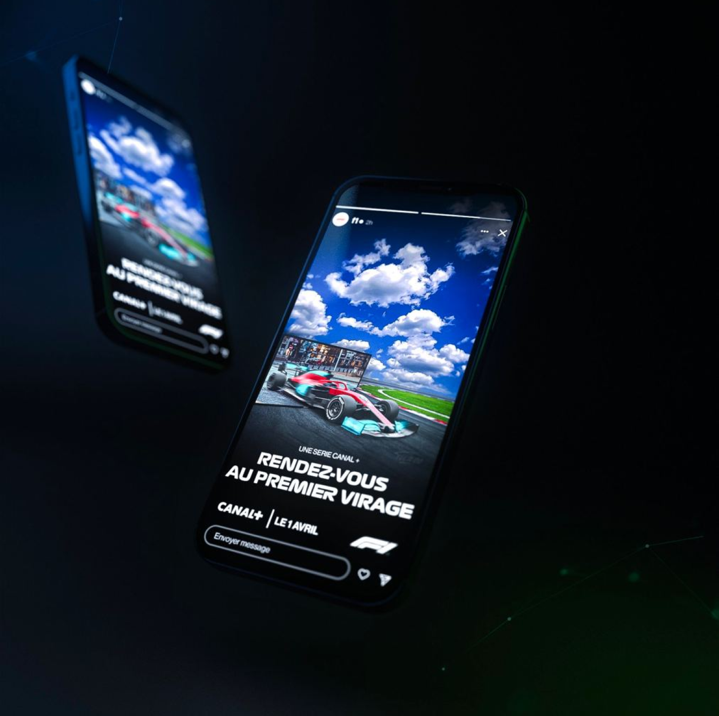 Affiche fictive pour une serie Canal + autour de la formule 1 qui se prénomme "Rendez-vous au premier-virage"